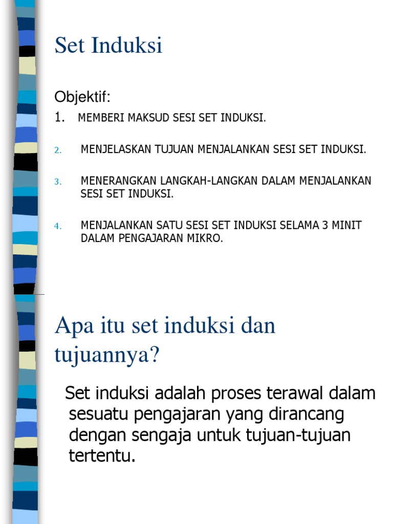 Set induksi merupakan satu set pembelajaran. 1 KEMAHIRAN SET INDUKSI Set induksi merupakan bahagian permulaan pengajaran atau pendedahan awal yang digunakan oleh guru. Dimana merupakan suatu proses atau aktivitas berpikir.